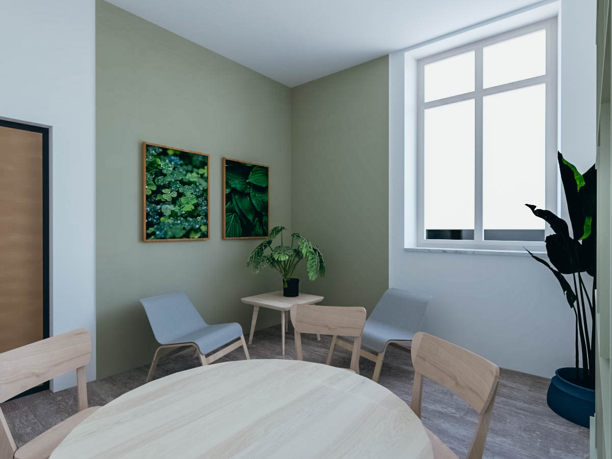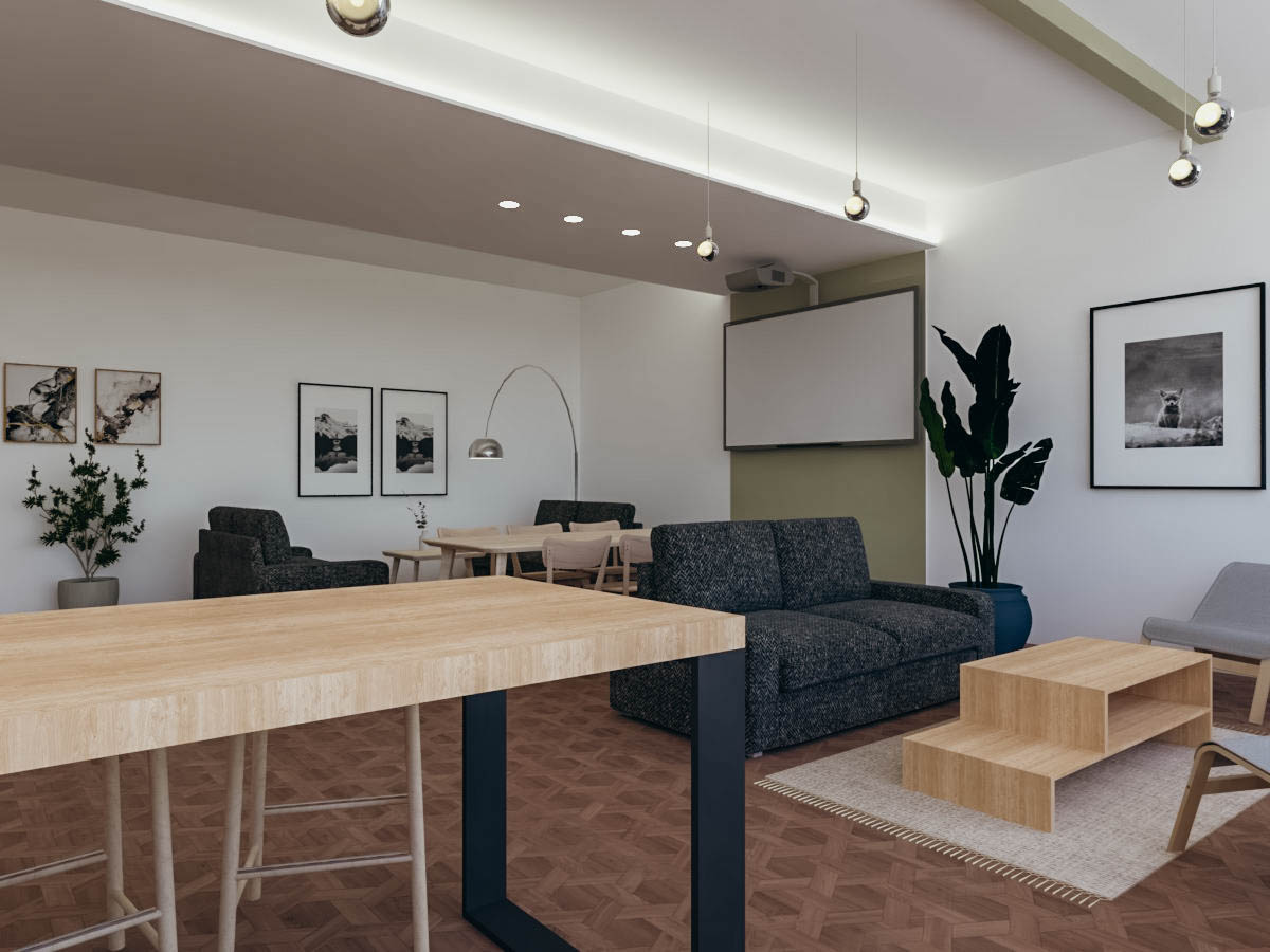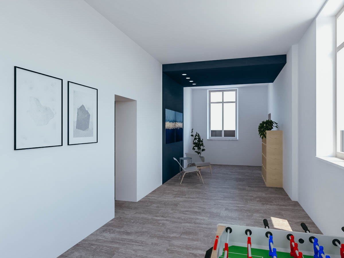 Dopo le valutazioni della commissione, è stata incaricata l’architetta Giulia Bertino per la progettazione. Nella stanza più grande si è pensato a un’area multifunzione che potesse essere utilizzata con assetti diversi in base alle esigenze della vita comune: come sala TV, salone per riunioni, per gli incontri pianificati dalla comunità nelle commissioni “vite dei santi” e “cultura”, o come spazio relax per fare due chiacchiere, una pausa caffè o un gioco serale. Questo salone si affaccia su un corridoio largo circa 3 m, pronto per essere utilizzato non solo come elemento di passaggio, ma anche come luogo dove sostare e fare una partita a calcio balilla o a ping pong, o dove fermarsi nell’area divani. Il corridoio dà accesso direttamente al cortile esterno, in cui è in progetto un campo da pallavolo e calcetto. Da esso si accede ad altre 3 stanze di diverse dimensioni, una che ospiterà il biliardo e le altre due come spazi per lo studio e la lettura.