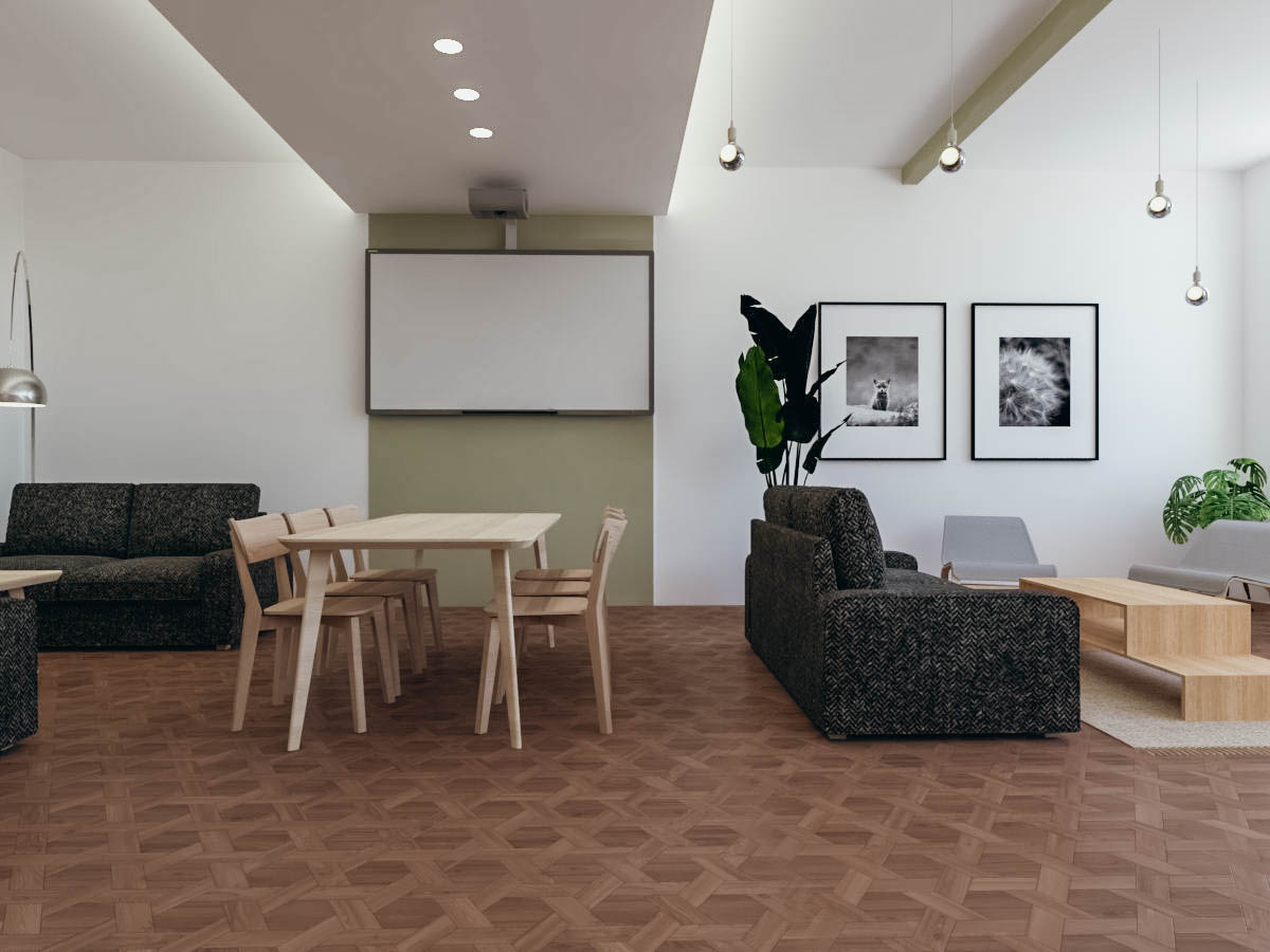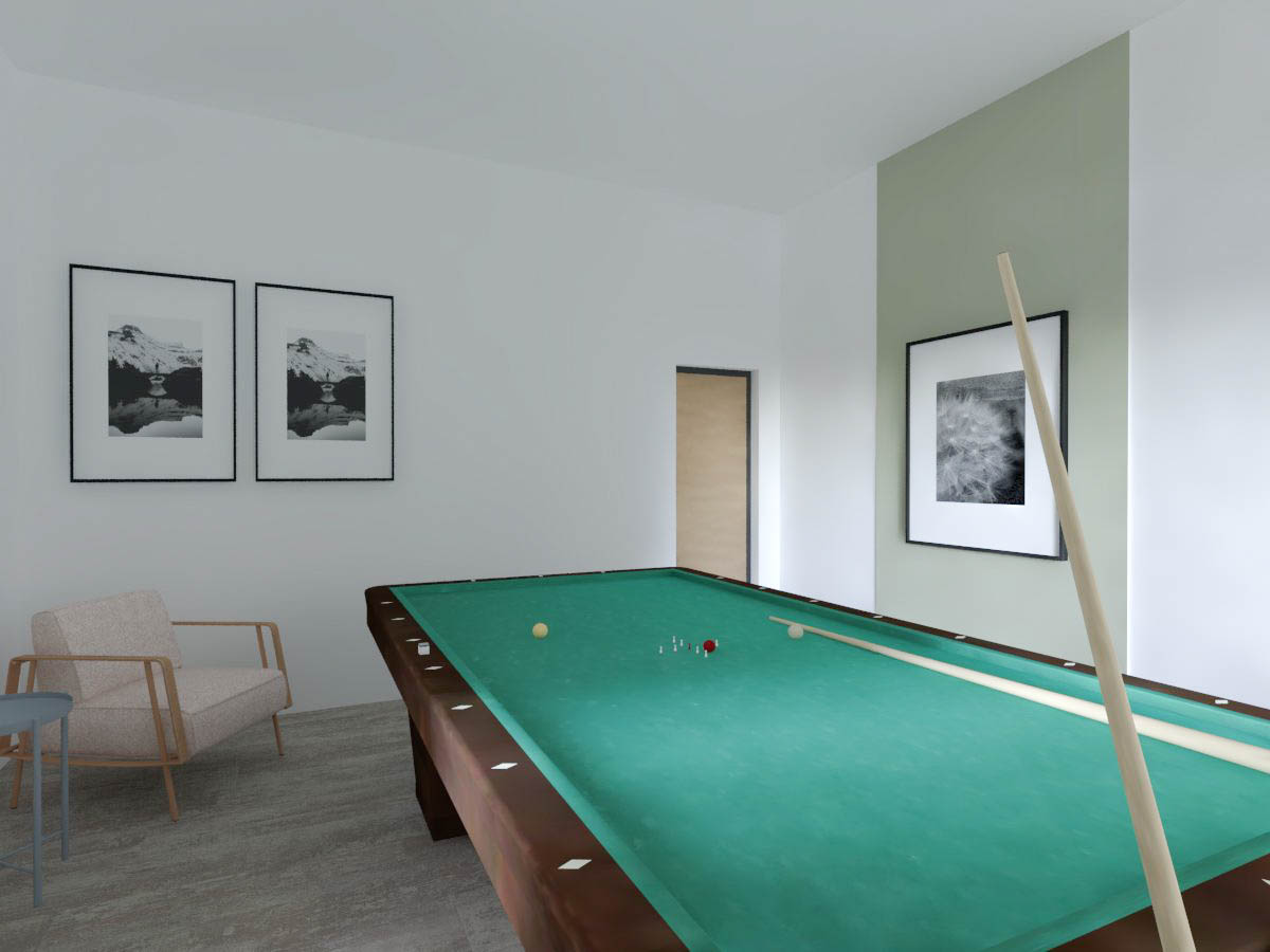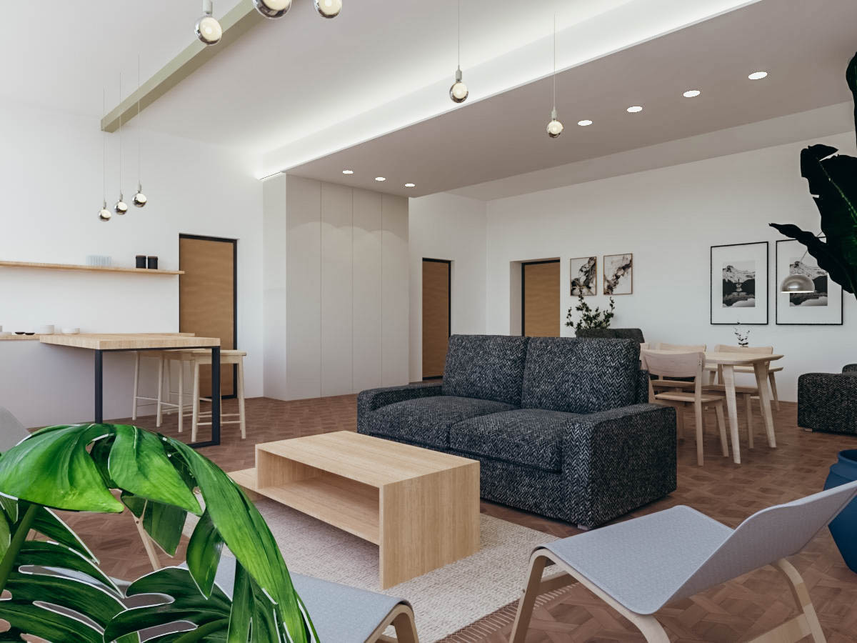 Dopo le valutazioni della commissione, è stata incaricata l’architetta Giulia Bertino per la progettazione. Nella stanza più grande si è pensato a un’area multifunzione che potesse essere utilizzata con assetti diversi in base alle esigenze della vita comune: come sala TV, salone per riunioni, per gli incontri pianificati dalla comunità nelle commissioni “vite dei santi” e “cultura”, o come spazio relax per fare due chiacchiere, una pausa caffè o un gioco serale. Questo salone si affaccia su un corridoio largo circa 3 m, pronto per essere utilizzato non solo come elemento di passaggio, ma anche come luogo dove sostare e fare una partita a calcio balilla o a ping pong, o dove fermarsi nell’area divani. Il corridoio dà accesso direttamente al cortile esterno, in cui è in progetto un campo da pallavolo e calcetto. Da esso si accede ad altre 3 stanze di diverse dimensioni, una che ospiterà il biliardo e le altre due come spazi per lo studio e la lettura.
